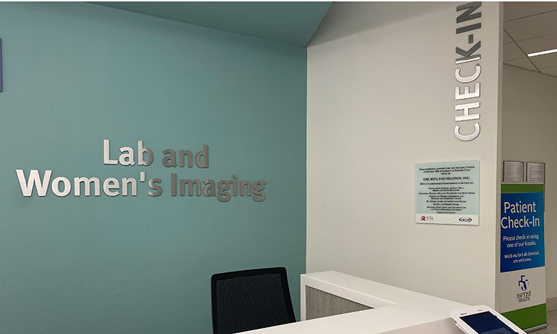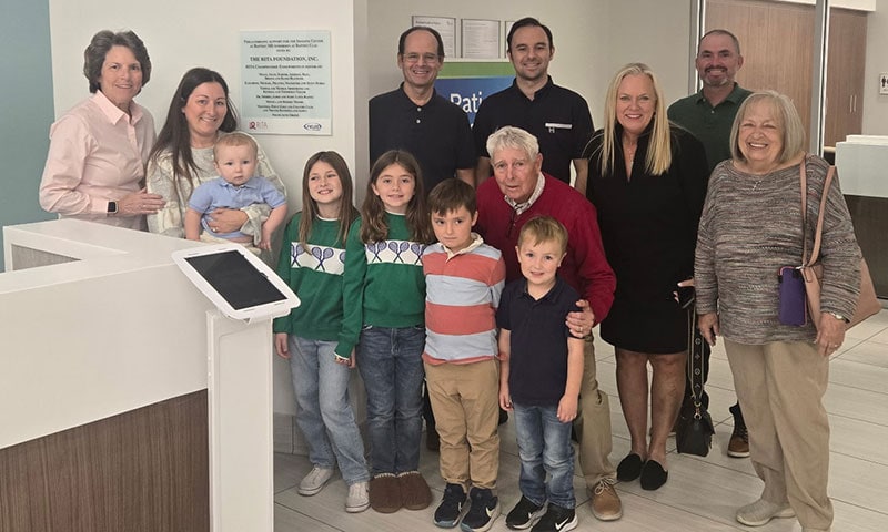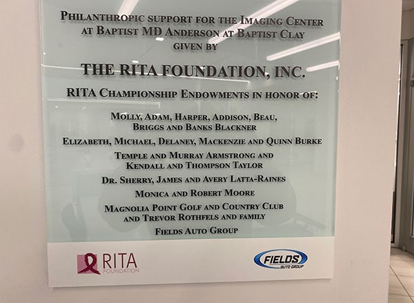 Dr. Sherry, James, and Avery Latta-Raines, Kendall Taylor, and her mother, Molly, Adam, Harper, Addison, Beau, Briggs, and Banks Blackner at the installation of the Rita Championship plaque honoring these endorsements that are funding mammograms for the underserved at Baptist MD Anderson Clay.